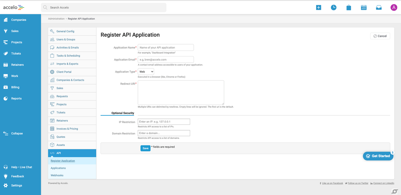 Open Accelo, then go to Settings > API > Register Application.