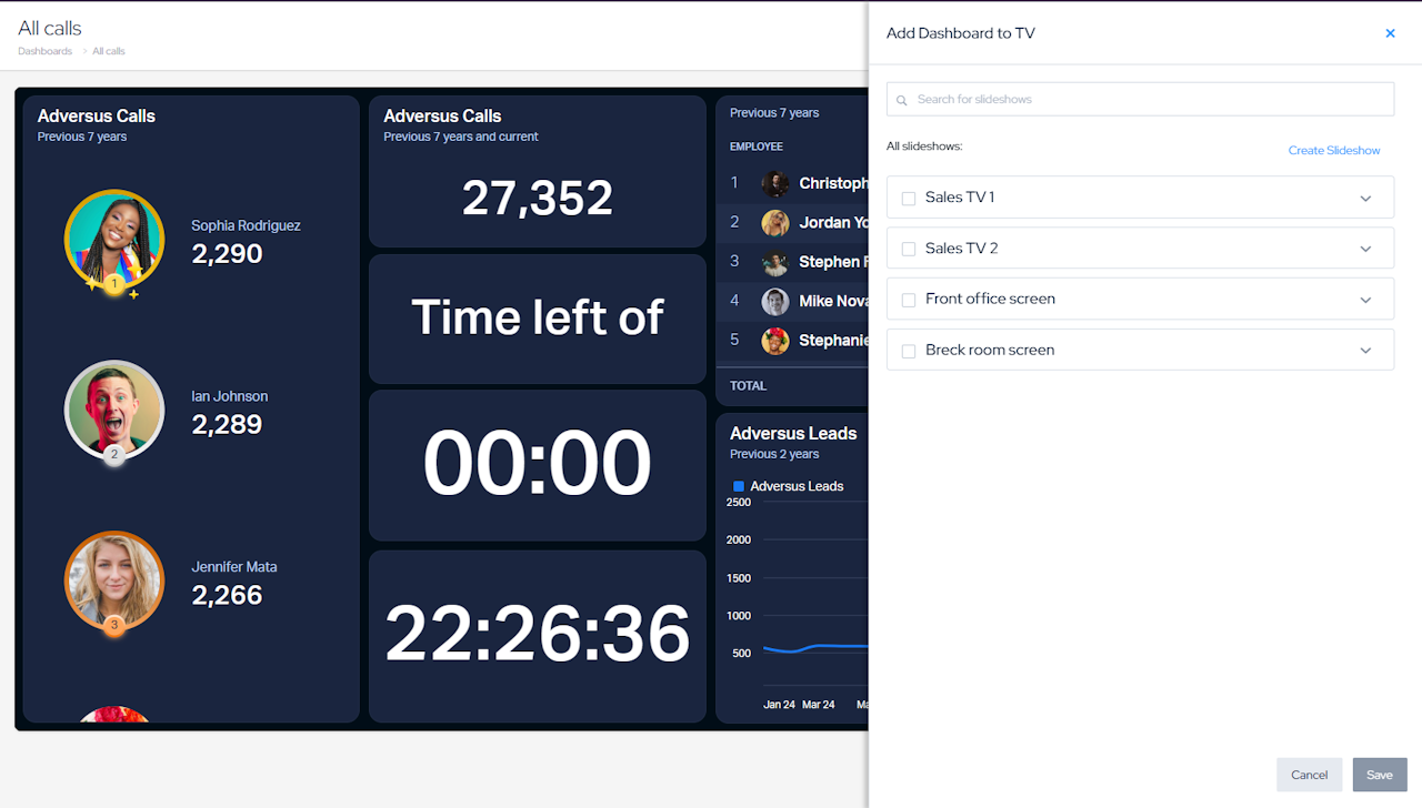 Use Add to TV to display your dashboards on TV screens around the office. This feature lets you add dashboards to slideshows, manage what appears on each screen, and activate new TV devices, all from within a dashboard.
