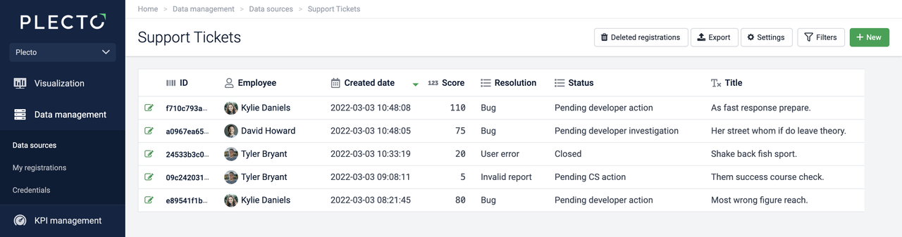 The same development team from above now wants to see how many bugs are pending both developer action and developer investigation. Here below is a data source that stores all data on support tickets.