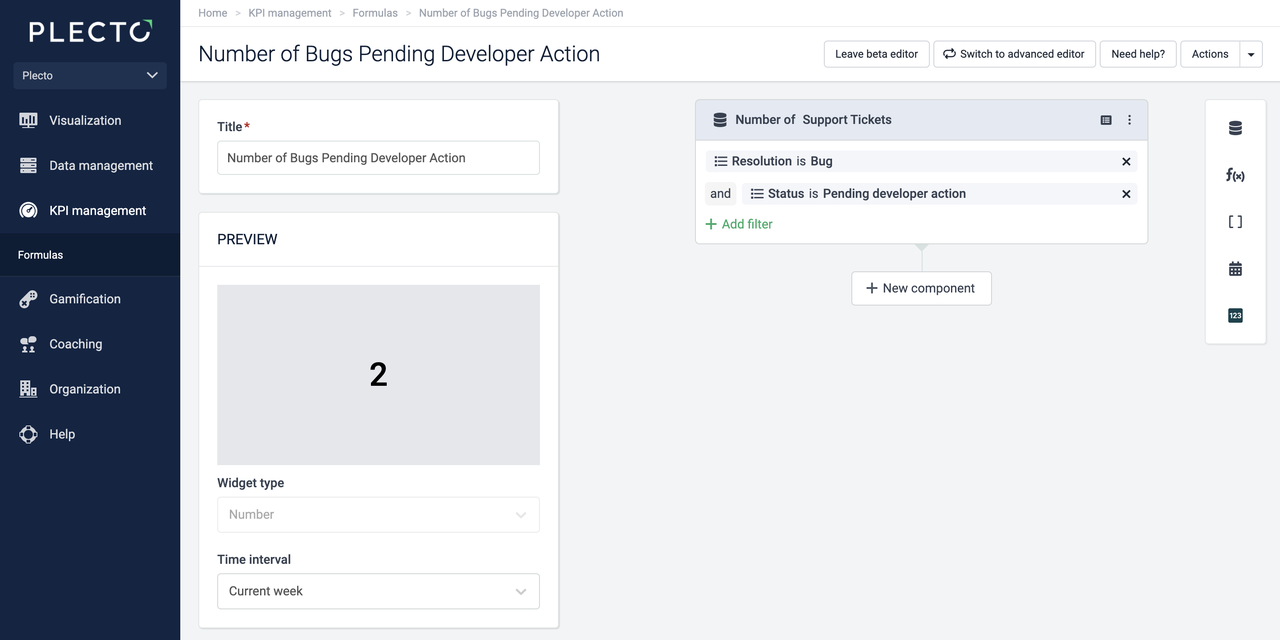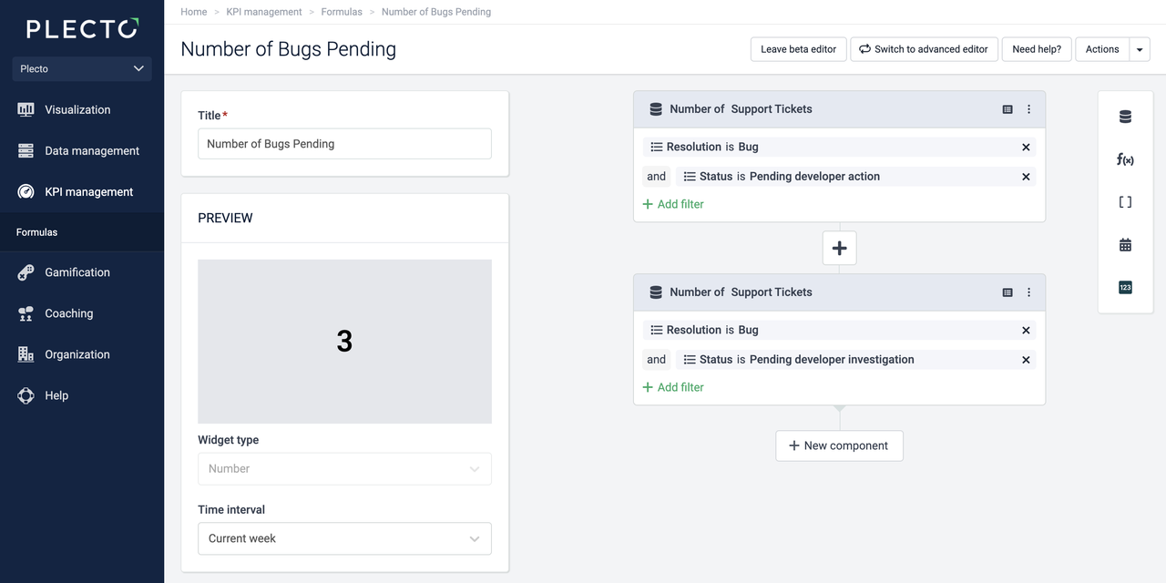 To find out how many bugs are pending developer action, the team manager builds the following formula: