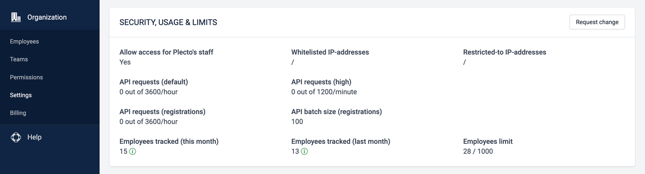 Admins can see the number of API requests and their limits on the Settings page in Plecto. All the details are listed under the section Security, Usage & Limits.