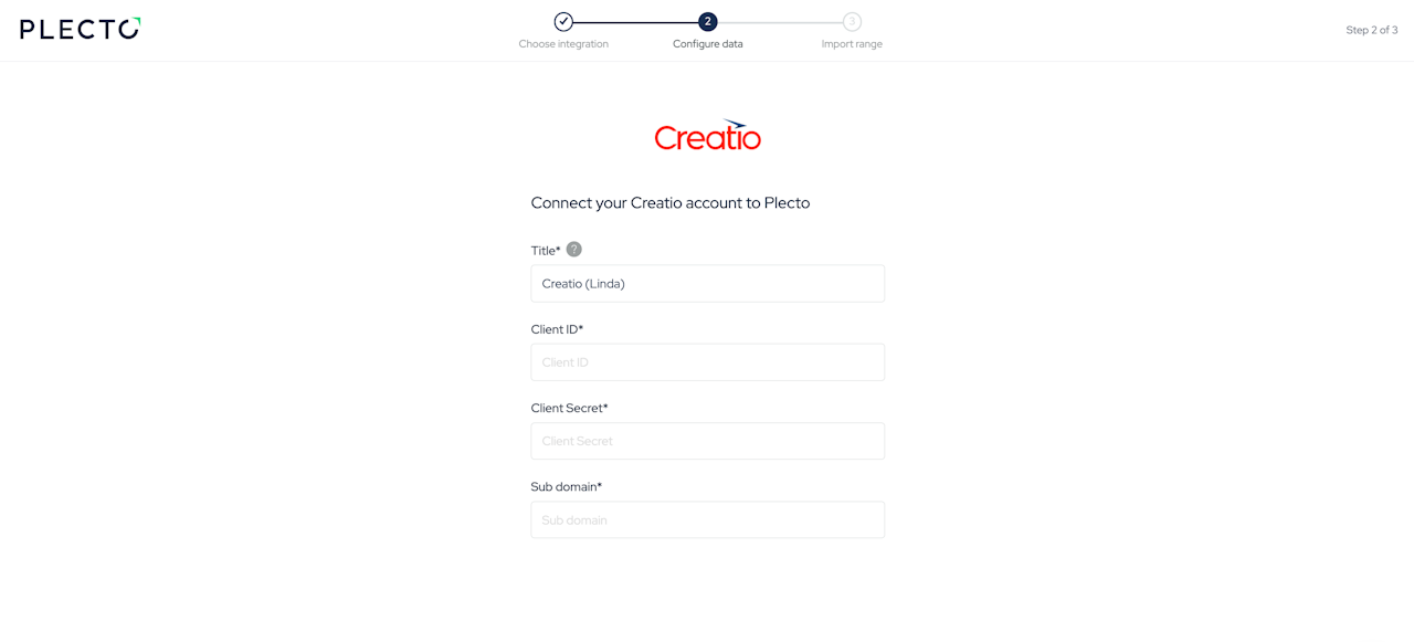 To integrate your Creatio data with Plecto, you need to provide a Client ID, Client Secret, and your Creatio subdomain.