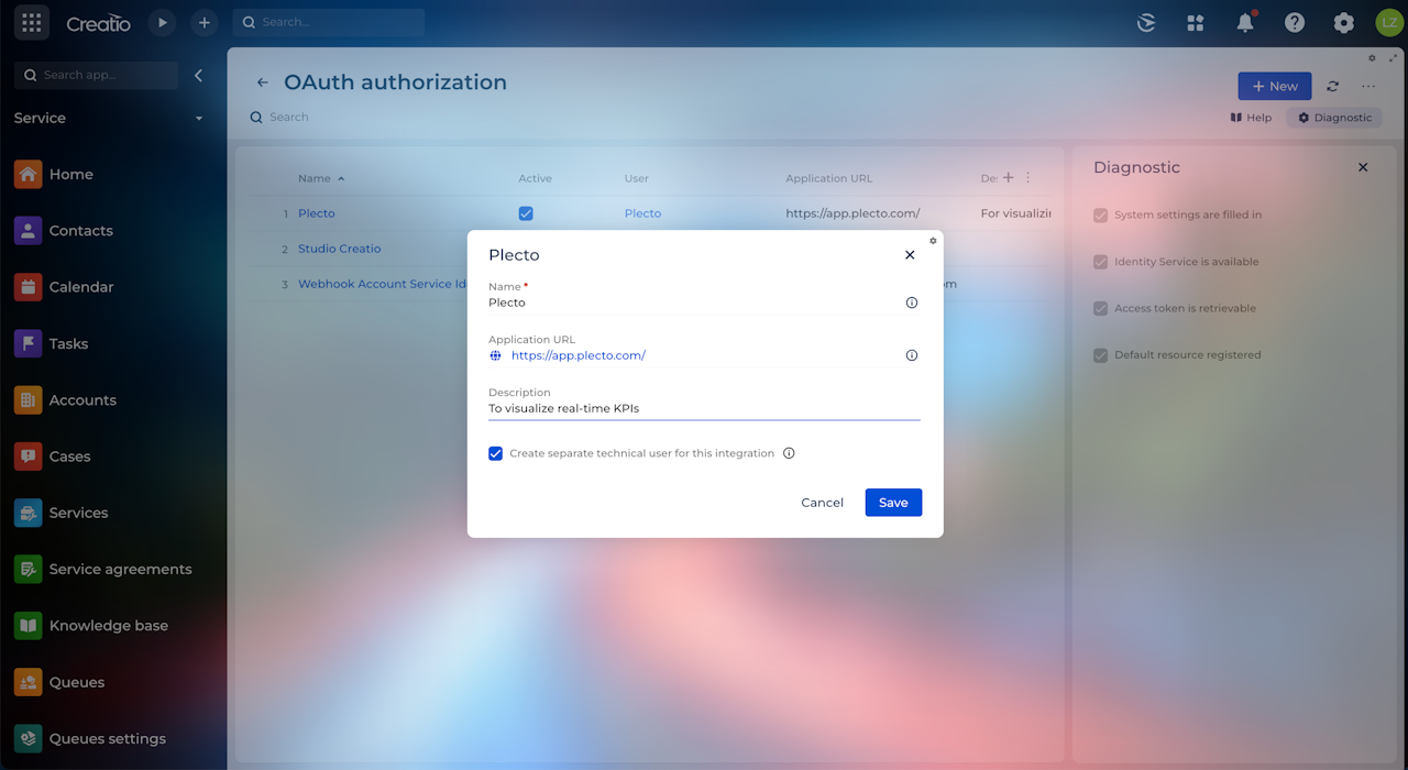 In Creatio, go to Settings > Technical users and select the Plecto user.