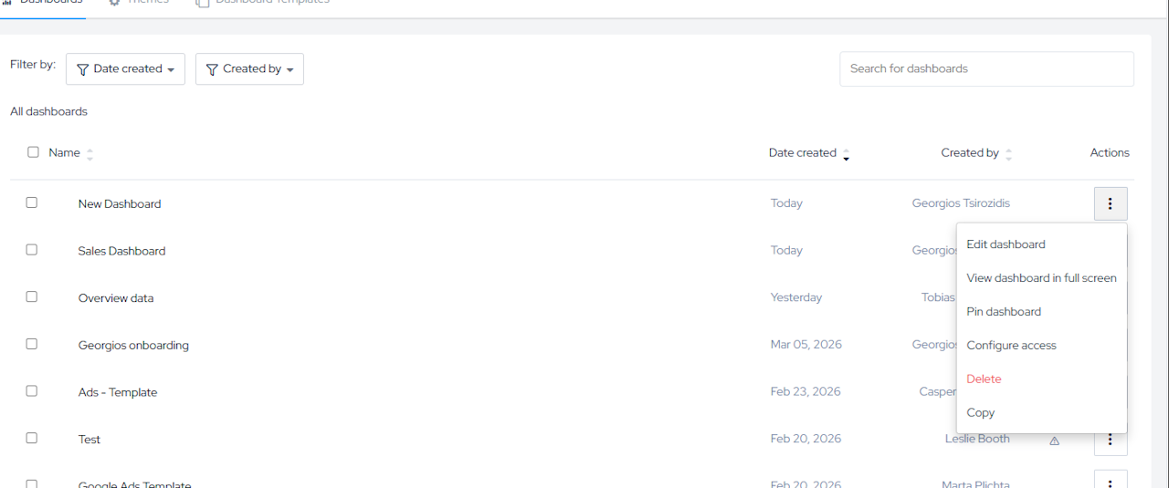 The dashboard list is your central hub for managing all dashboards in your organization. From here you can create new dashboards, search and filter existing ones, and perform actions on one or multiple dashboards at once.