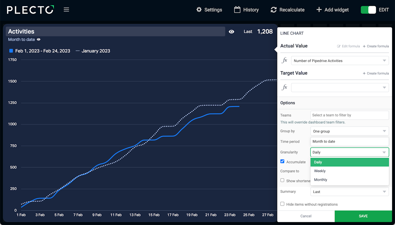 Accumulate the data points and track the total progress of your performance. For example, use it to see the total value of closed deals, completed tasks, or others, within your chosen time period.