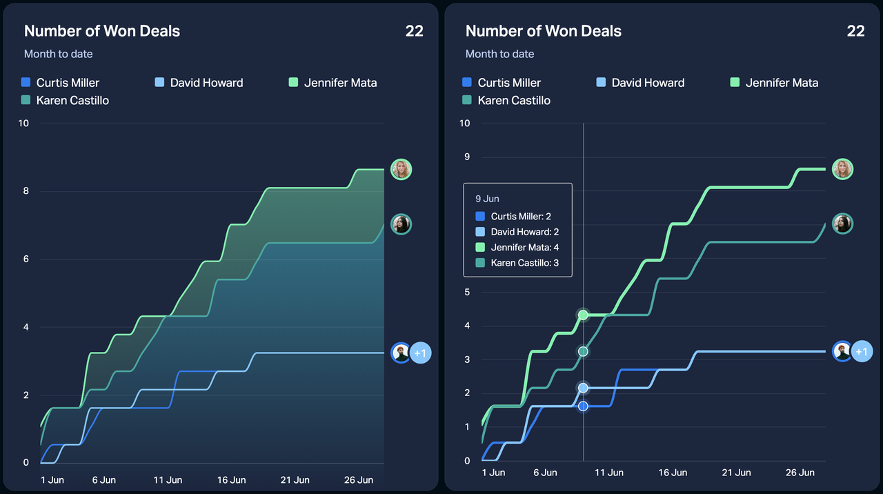 Accumulate the data points and track the total progress of your performance. For example, use it to see the total value of closed deals, completed tasks, or others, within your chosen time period.