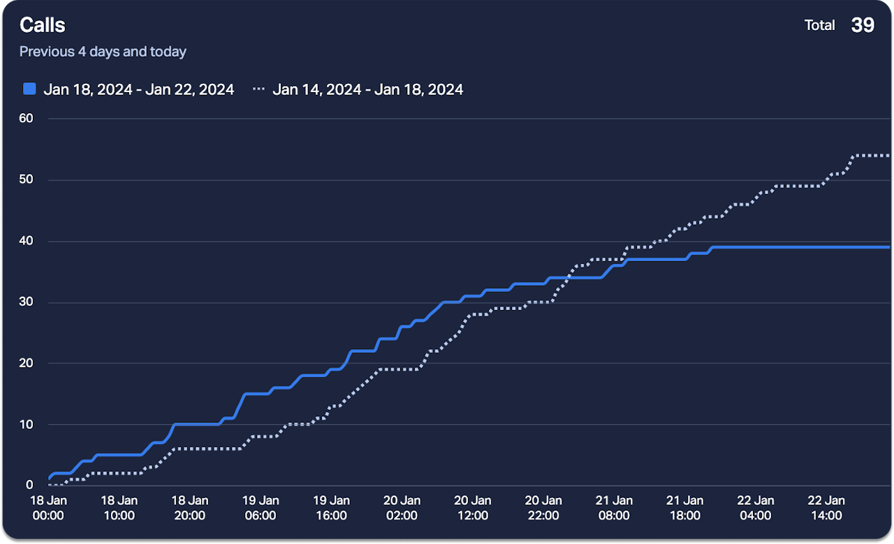 If the Group by option is set to None, you can compare the current KPI to the previous time period – for example, see the number of deals this month vs. last month, calls today vs. yesterday, and so on.