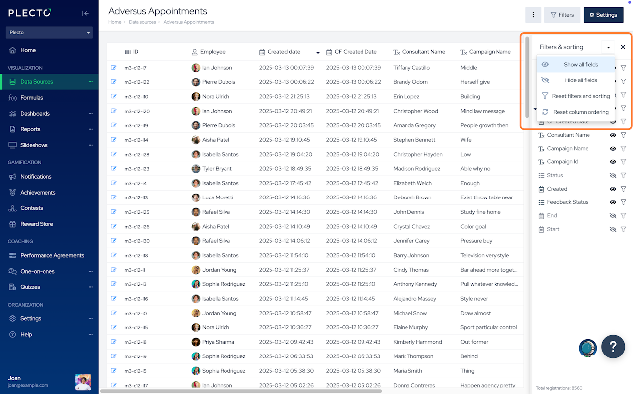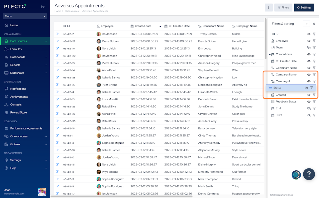 Data sources are organized in rows and columns. In Plecto, we call them registrations and fields.