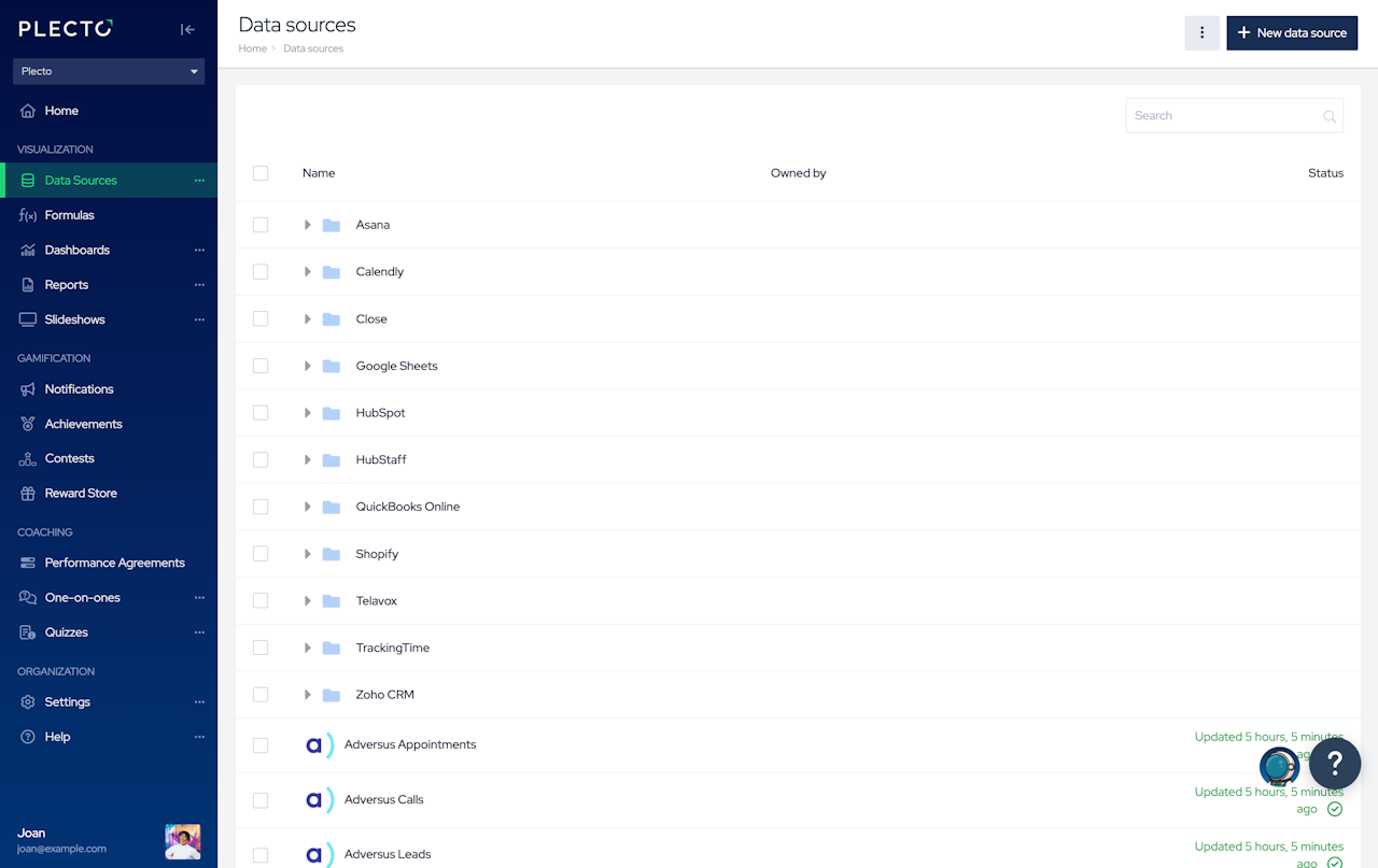 A data source contains all your raw data. It can store information about your calls, sales, transactions, projects, tasks, and any other metric you use.