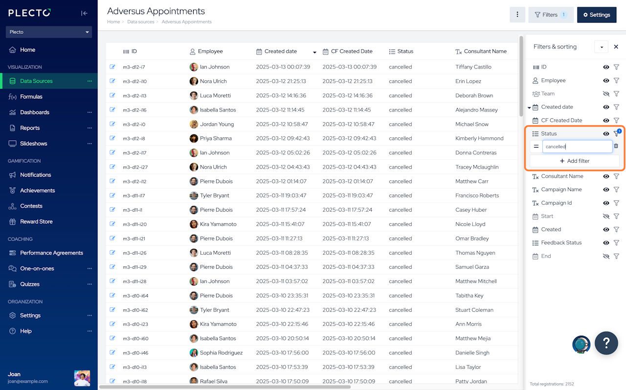 To apply a filter, click the filter icon on the right of a field name and set the filtering parameters. For example, Status = cancelled if you want to see all your cancelled appointments.
