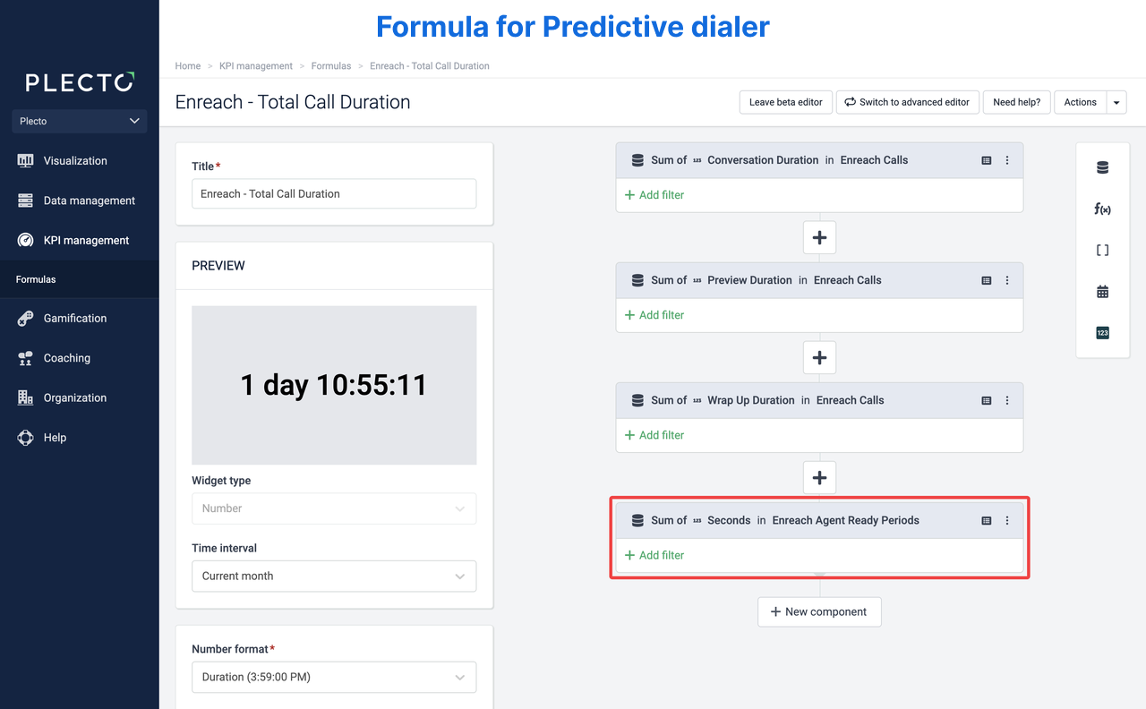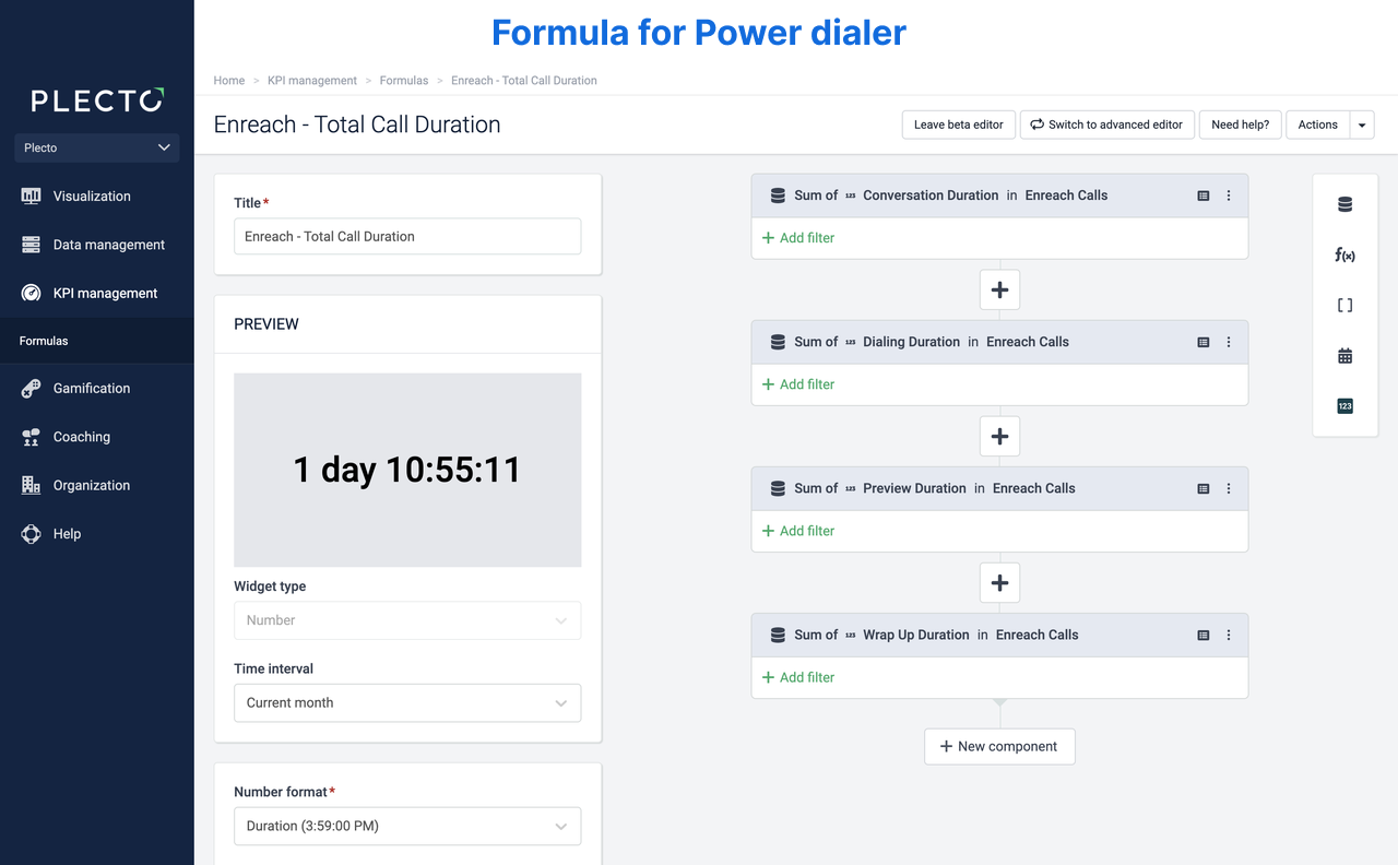 Sometimes, the total call duration in Plecto doesn't match the results in Enreach – that's because of the dialing time. The formulas you need to build in Plecto depend on whether you use the power or predictive dialer in Enreach.