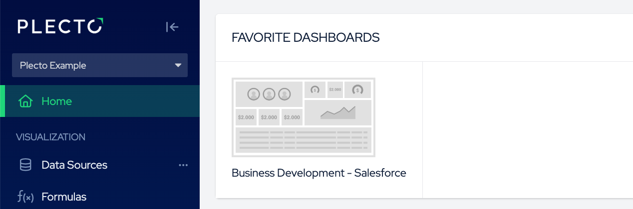 When you go back to the front page (click the Plecto logo in the top-left corner), you will see the dashboard shortcuts and the organization name they belong to.