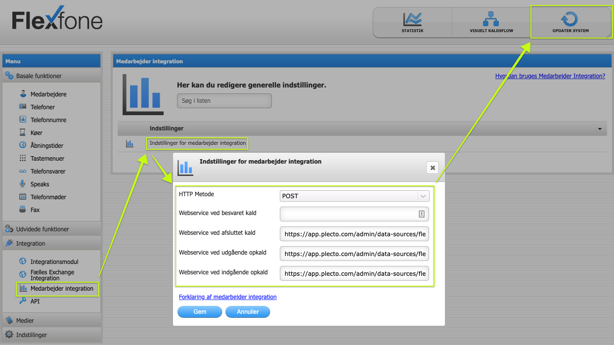 Click Indstillinger for medarbejder integration. This will open a popup.