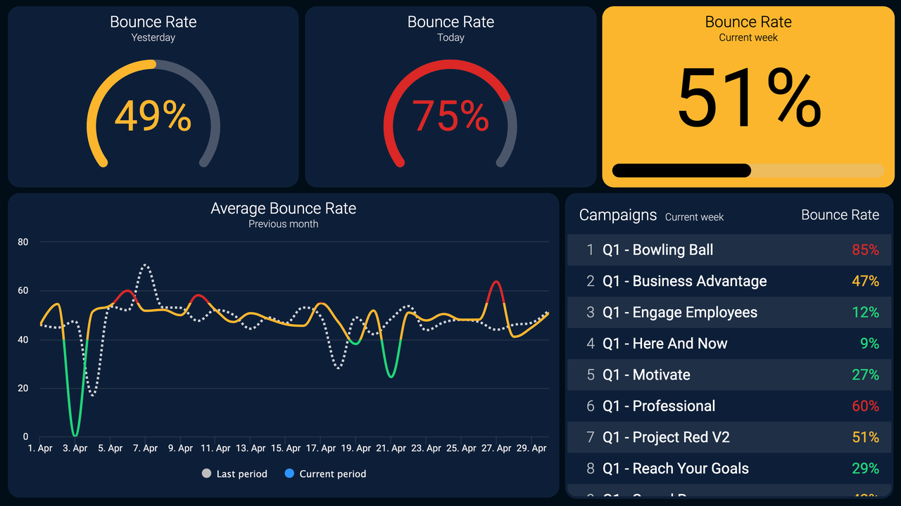 Visualize your bounce rate on number box, speedometer, table, or other widgets. Add conditional colors to see if your bounce rate is within norm or if it should be improved.
