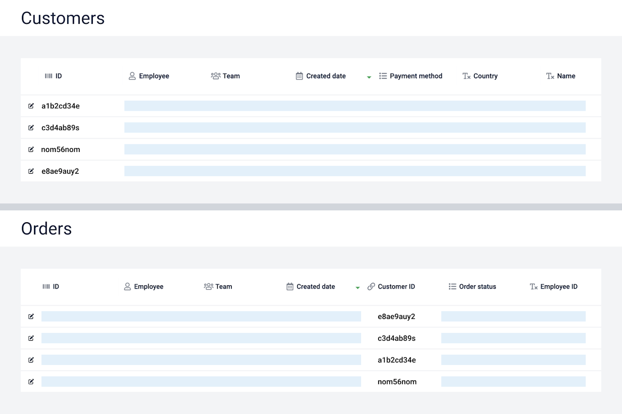 Data source Orders contains a field called Customer ID that links to a data source called Customers. So when you check information about a specific registration from Orders, you can also see the data about the customer.
