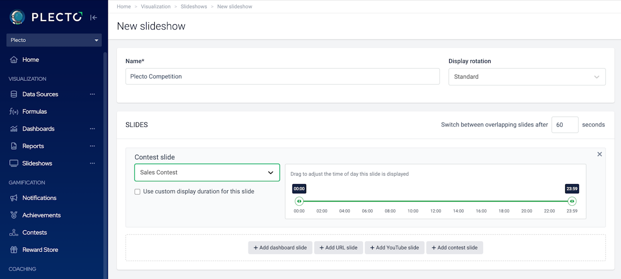 If you want to see your contests on TVs just like dashboards, you need to add them to a slideshow.