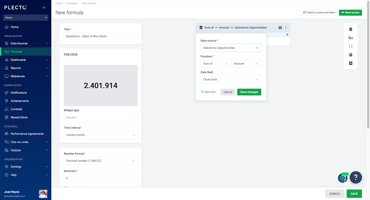 All formulas are built in a formula editor. In Plecto, we offer two editors: