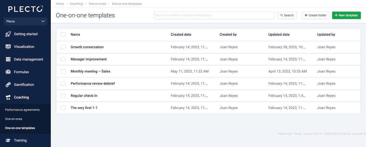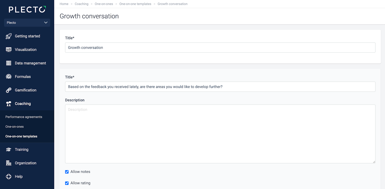 One-on-ones are based on your own custom templates. Each template should include different sections with questions, KPIs, targets, or other things you would like to discuss during the meeting with your employee.