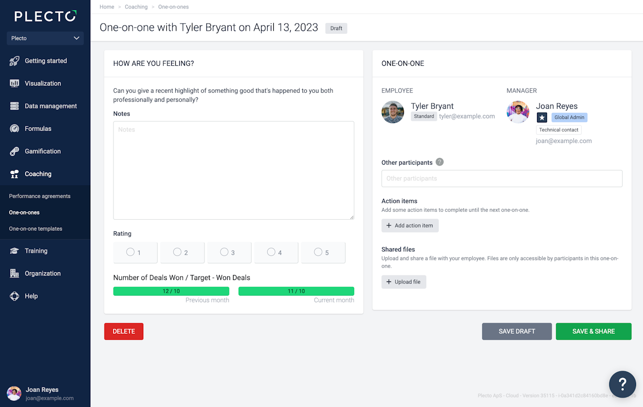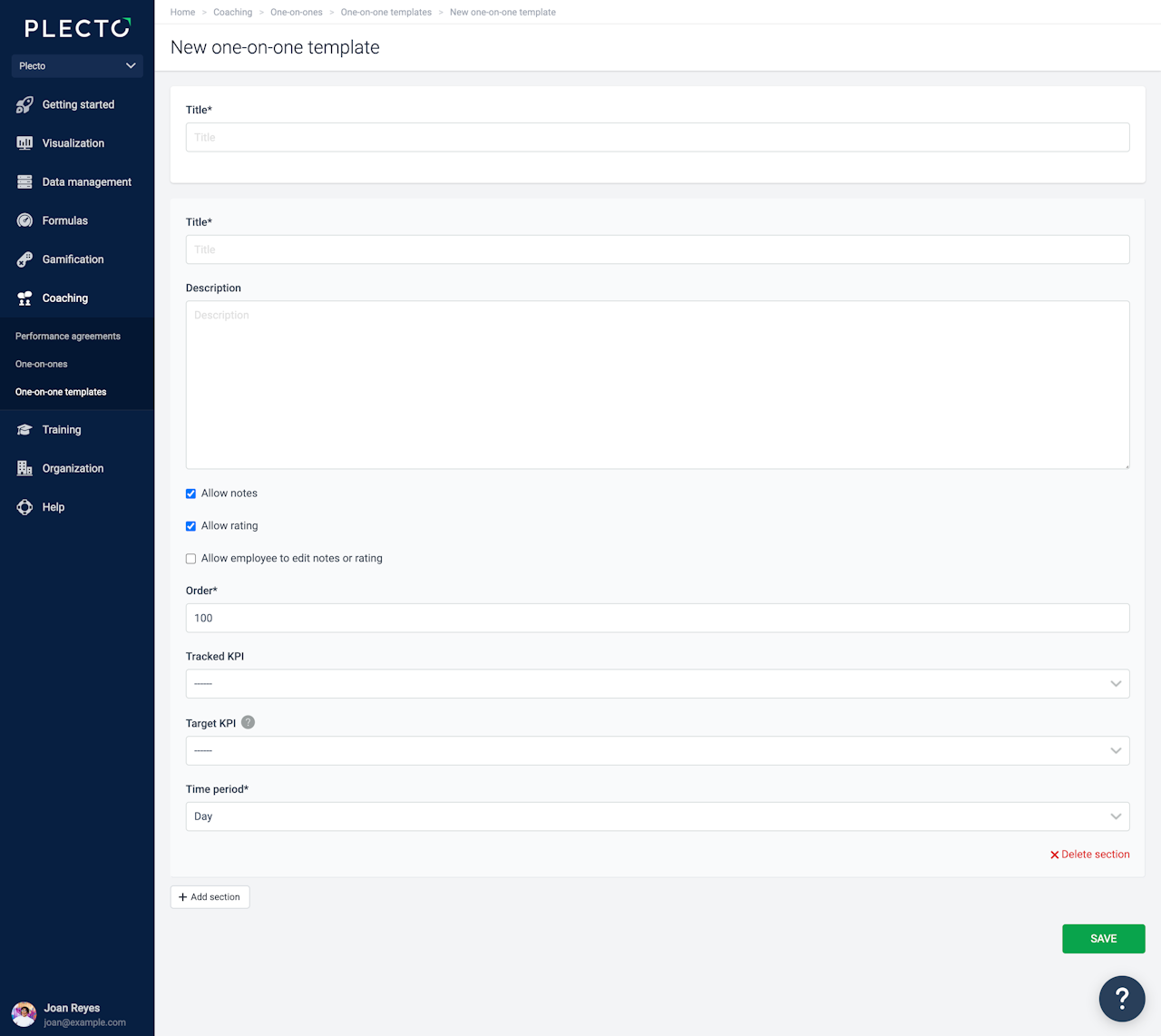 One-on-ones are based on your own custom templates. Each template should include different sections with questions, KPIs, targets, or other things you would like to discuss during the meeting with your employee.