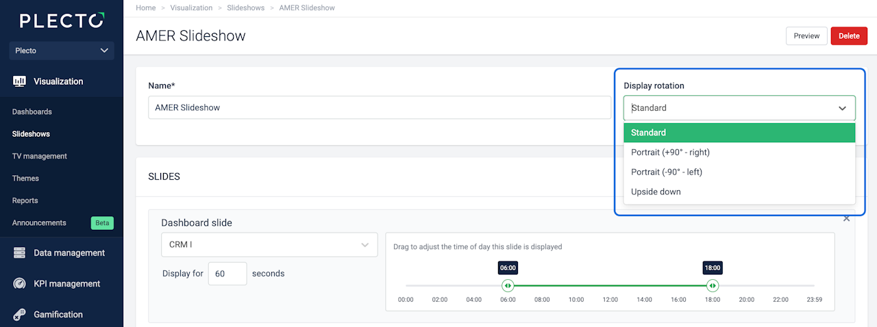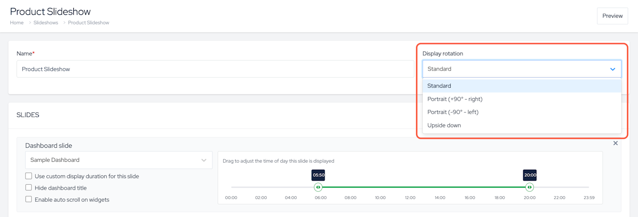 If some of the TV screens in your office are placed vertically, you can rotate the slideshow to accommodate the screen setup. Choose between Standard, Portrait, and Upside-down rotation.