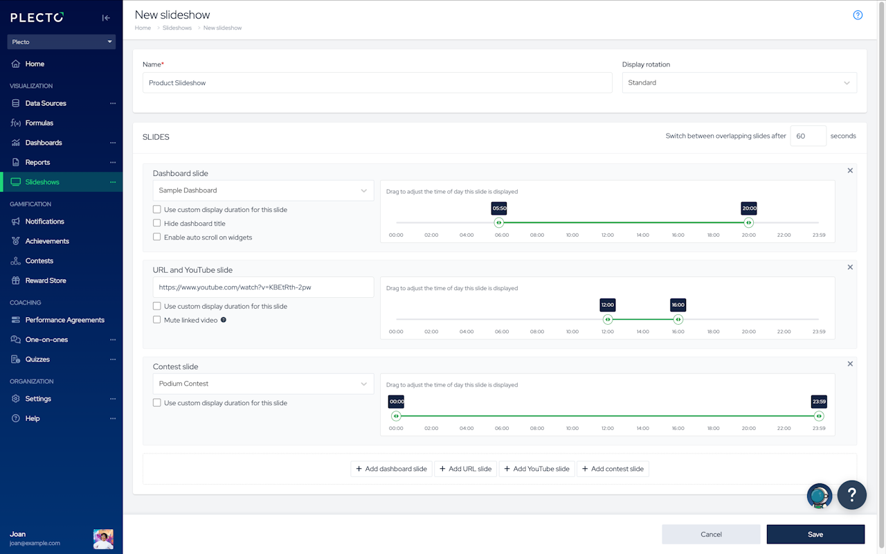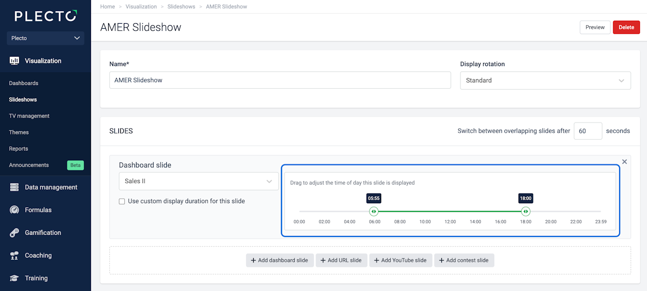 Drag the edges or click on the hour of a timeline to adjust when the slide gets displayed. For example, if you set the time between 12:00 and 20:00, Plecto will only show the slide between these hours.