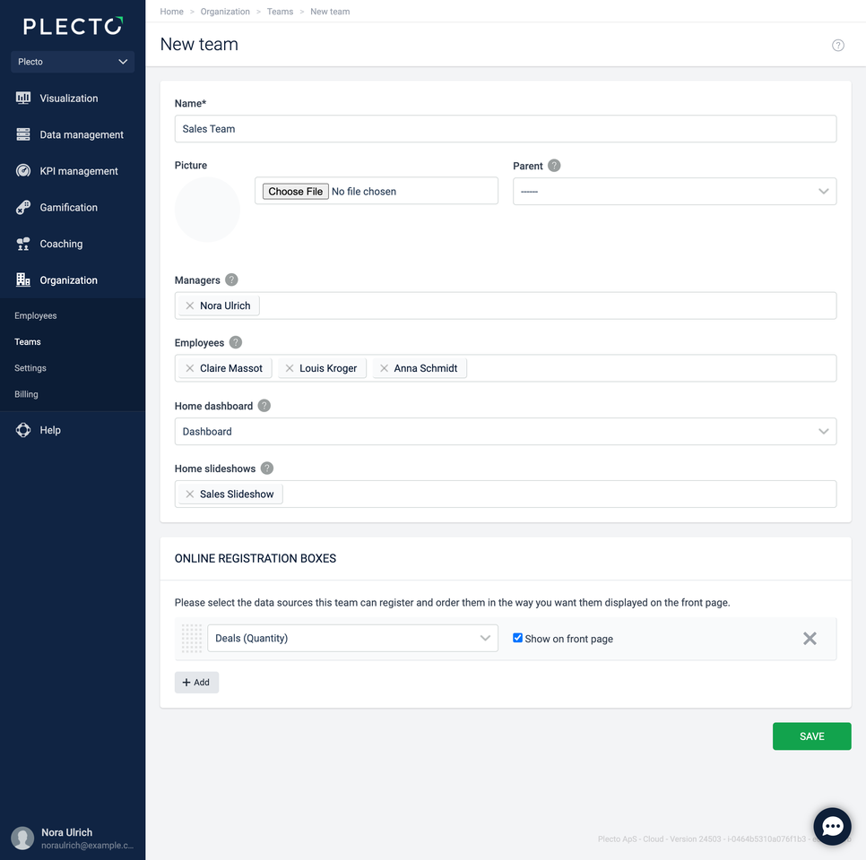 (Optional) Online registration boxes. Add manual data sources, and your team will be able to add registrations from Plecto's front page. They will not gain access to the data sources.