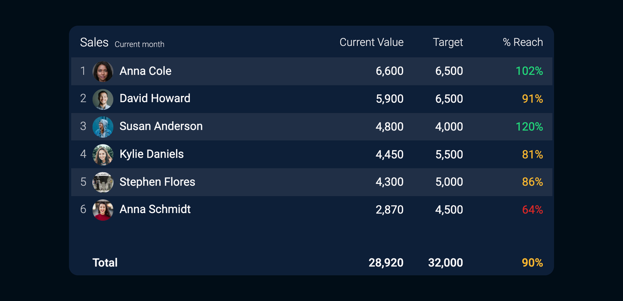 You can now add your KPIs to dashboards. The best way to get an overview and compare the actual values with employee targets is by adding a table widget to the dashboard.