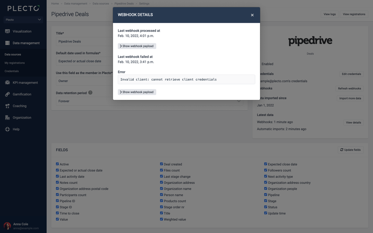 On the right side, you will see a section called Latest data and the last time your data source got updated. Click the View details button to see the webhook details.