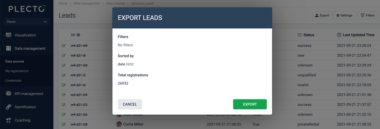 Click Export to finish. The spreadsheet with data from your Plecto data source will download on your local device.
