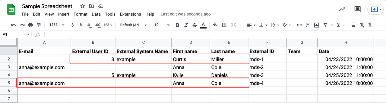In a single row, provide Email + First name + Last name altogether. curtis@example.com, Curtis, Miller This option is useful if an employee already has a profile in Plecto. If the first and last names are different than in Plecto, we will update the employee names with the imported names from the spreadsheet. If they're not part of Plecto yet, we will send an invitation to the specified email. | In a single row, provide External User ID + External System Name + First name + Last name altogether. ab13yu5, Salesforce, Curtis, Miller This is a more technical option and it's similar to what we require if you send data via API. You can come up with your own External User ID and System Name (for example, Excel). The External User ID must be unique for each employee. |