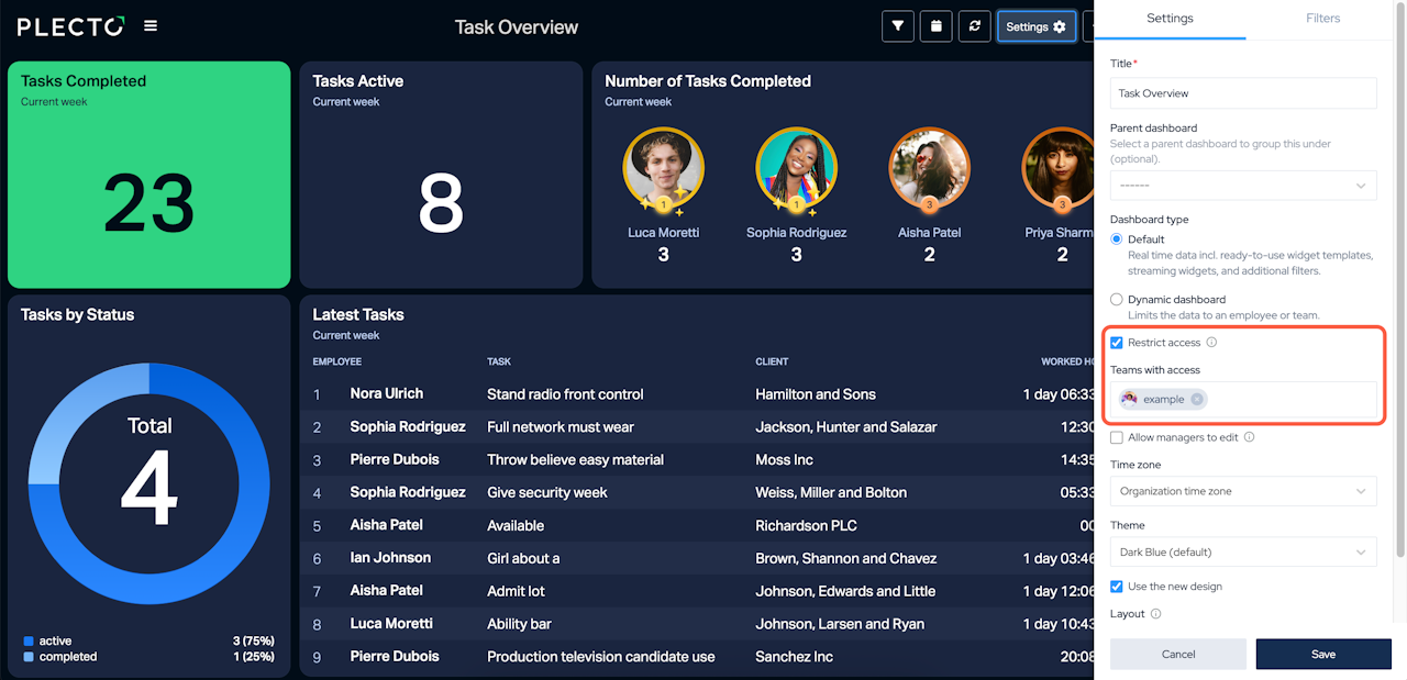Only the teams listed in the access settings (and their sub-teams) can view a restricted dashboard.