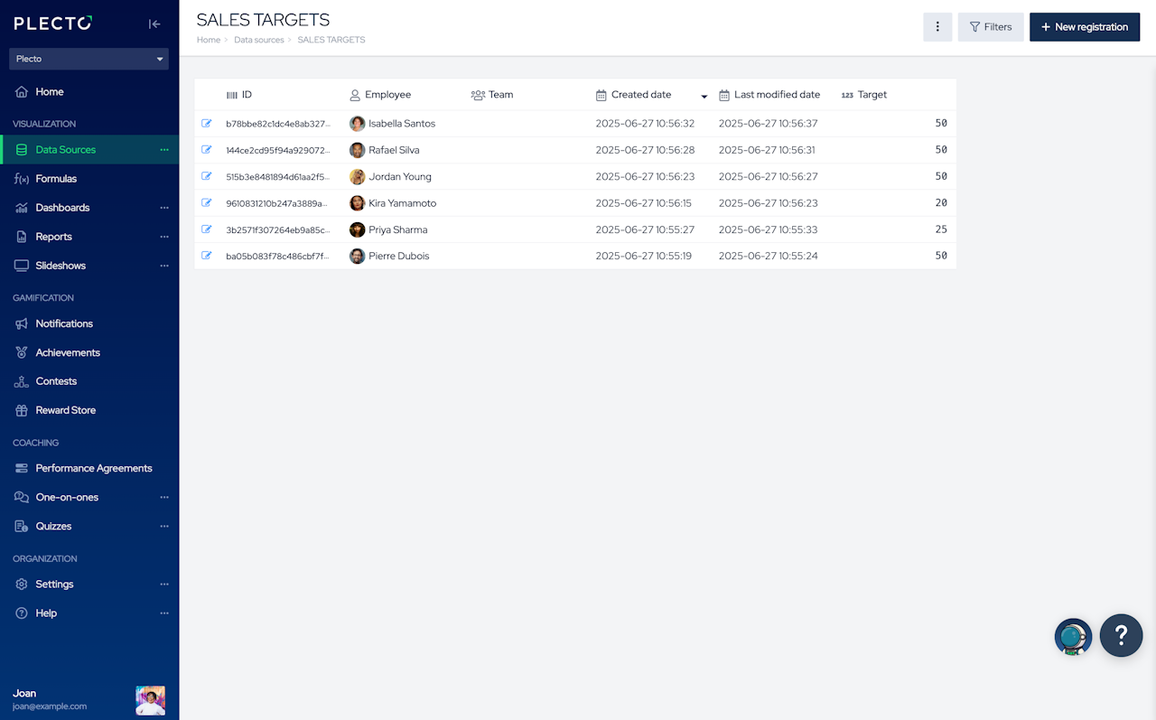 • If the spreadsheet contains emails from users that are not part of your Plecto organization but are members in another organization, Plecto will not insert their data into the data source. To import data for these users, invite them to your organization.
