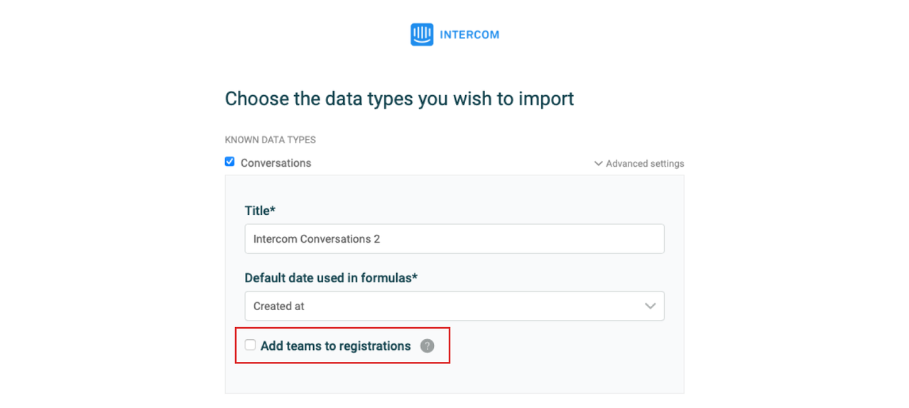 Choose the data you want to import. If you select Conversations, Conversation Parts, or Conversation Ratings, you can enable Add teams to registrations for these when you configure the data source settings (read more below).