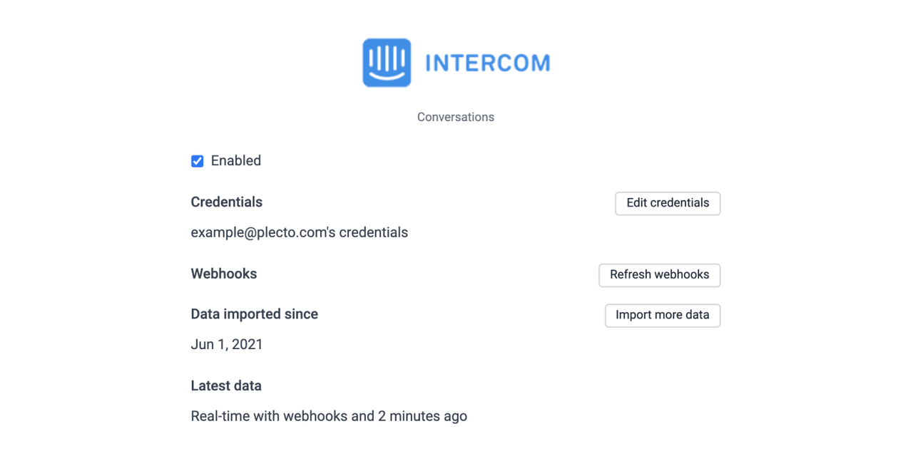 Our integration to Intercom supports webhooks. Webhooks allow Plecto to update your conversation data in real time and let you see when the conversations are created, deleted, closed, and more.