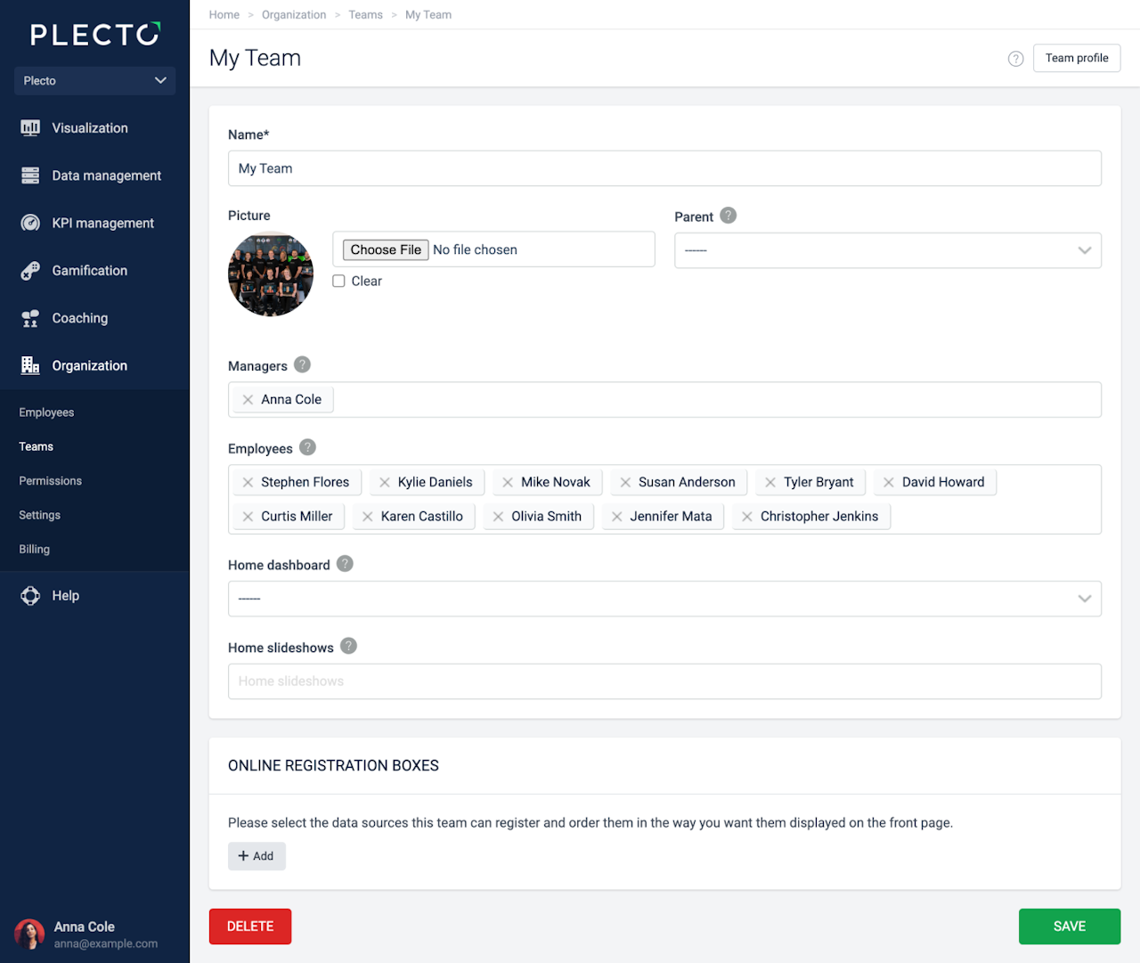 Create teams in Plecto and visualize team-specific KPIs on dashboards, reports, contests, and more!