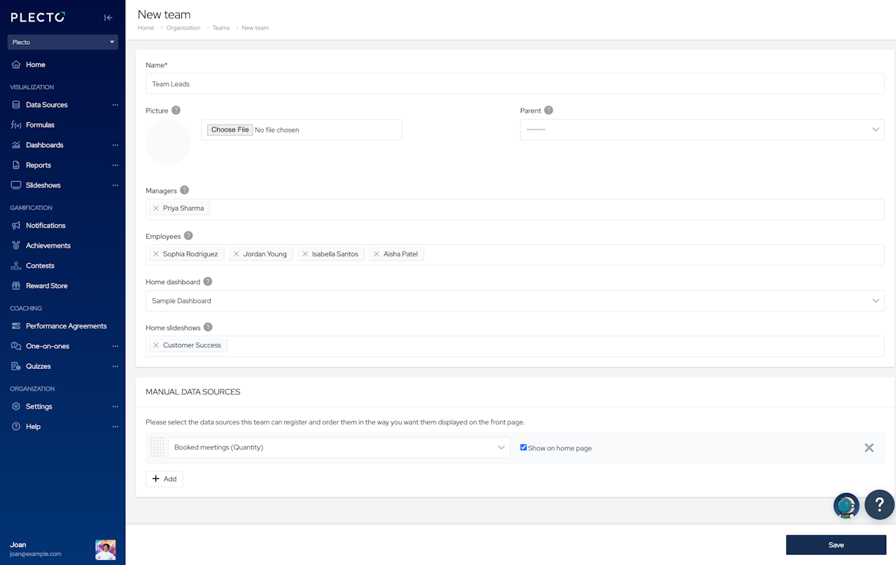 Create teams in Plecto and visualize team-specific KPIs on dashboards, reports, contests, and more!