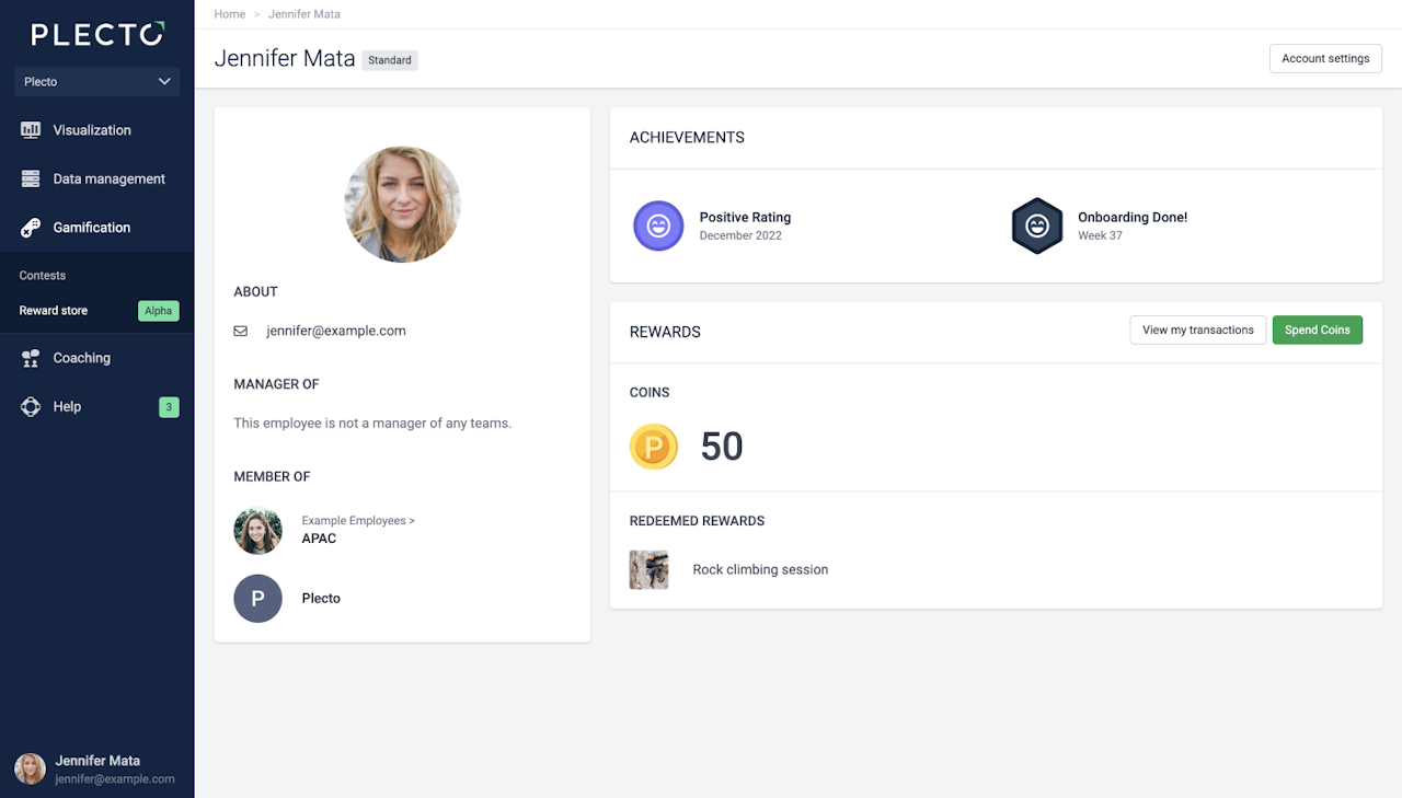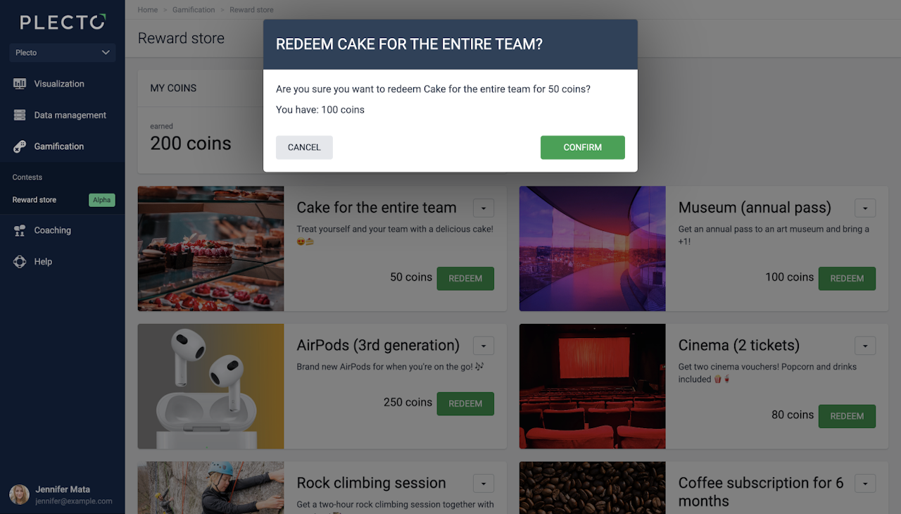 All redeemed rewards are listed in each employee's profile. Unless they're an admin, each person can only see their own coin balance and redeemed rewards.