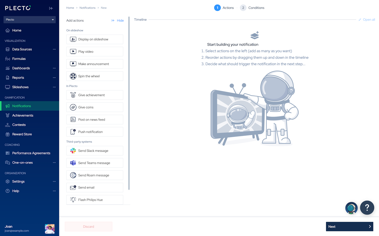 Notification actions are the different ways you can launch a notification from Plecto. It's what happens when the notification triggers. 🎉