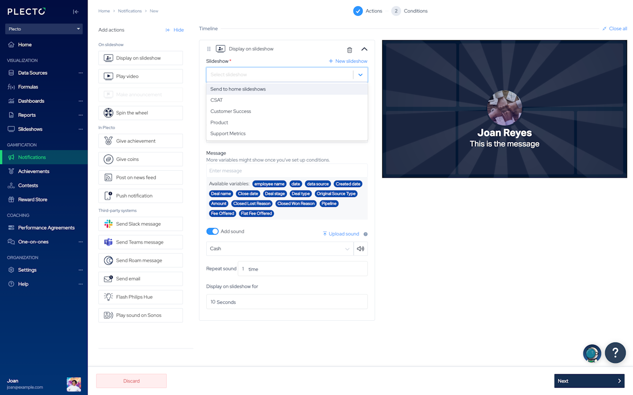 Once you've updated the notification actions, Plecto will make sure to send the notification to the right team. It means that only the team whose members trigger the notification will get the notification on their slideshow.