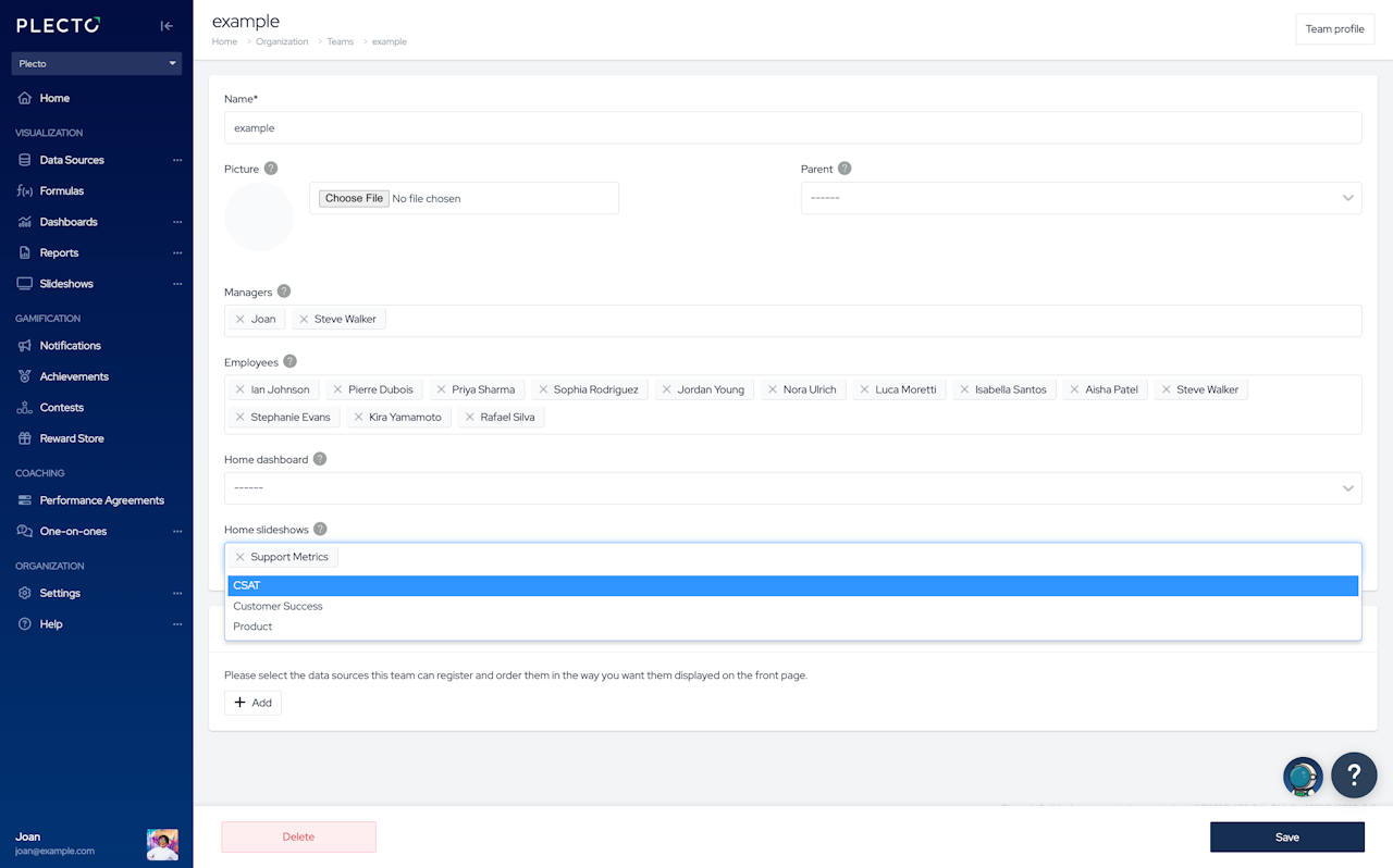 If you create a notification and simply add it to a slideshow, it will trigger and notify both teams, regardless of who's made the sale. With home slideshows, you can make Plecto send the notification only to the team that's triggered the notification.