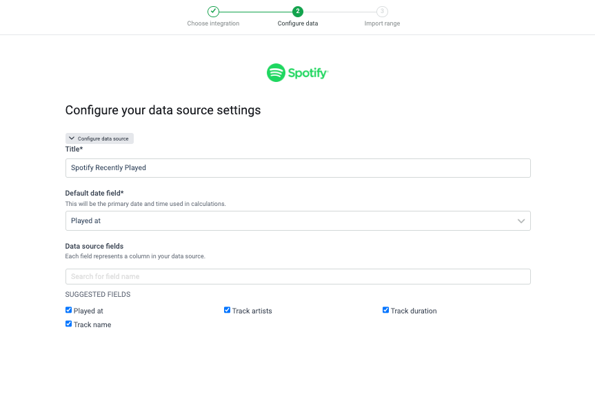 Configure your data source settings. Here, you can change the title, choose the default date, select which fields to import, and more.
