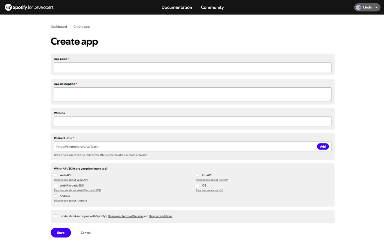 Agree to Spotify's terms of service and click Save.