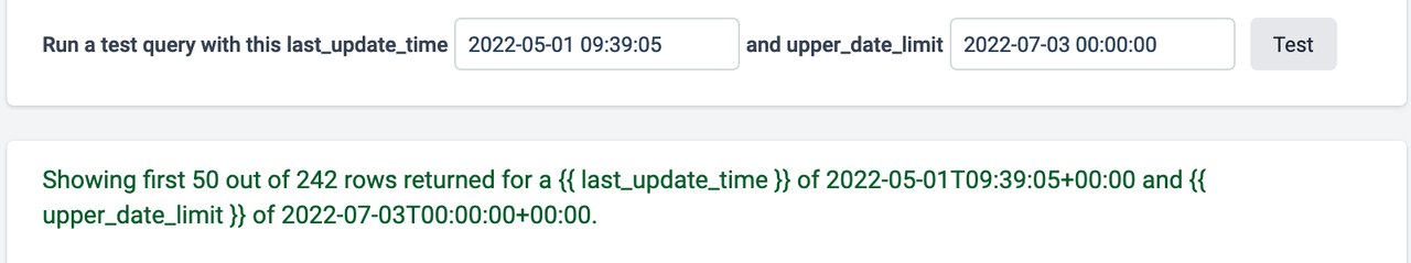 date field >= {{ last_update_time }}You can also add an upper date limit that will keep Plecto from importing data newer than the indicated limit. Use the following function:
