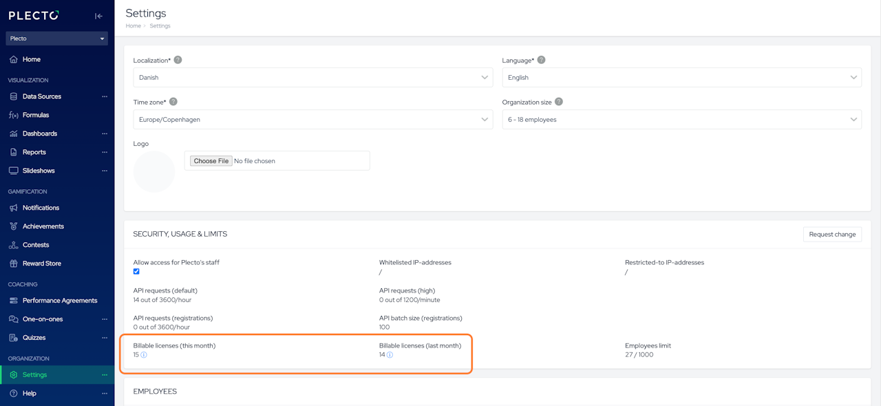 Admins can find the list of tracked employees both on the Settings and Billing page in Plecto. The number of employees tracked for this month must always be the same as the number of licenses included in your subscription.