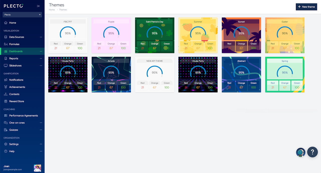 Use different themes and customize your Plecto appearance. Different themes can be applied to both dashboards and contests.