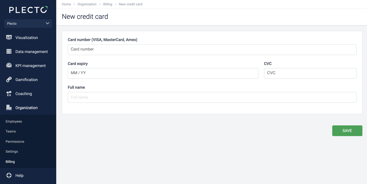 Global admins and employees with permission to access the Billing page can add or remove payment cards in Plecto.