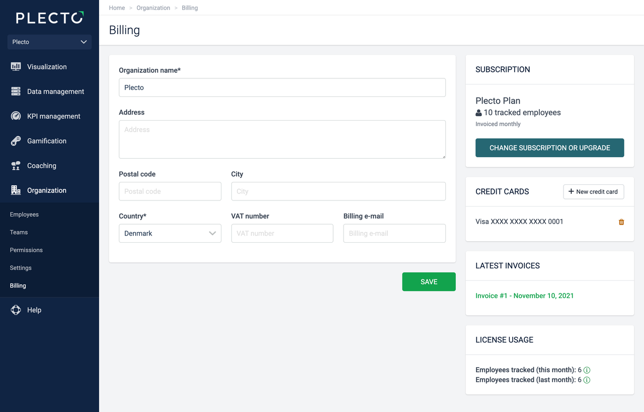 Global admins and employees with permission to access the Billing page can add or remove payment cards in Plecto.