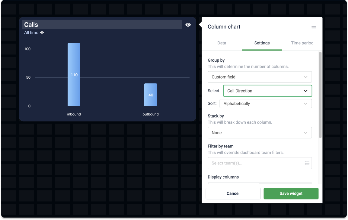 Widgets that support grouping by custom fields are table, line chart, area chart, column chart, and donut chart widgets.