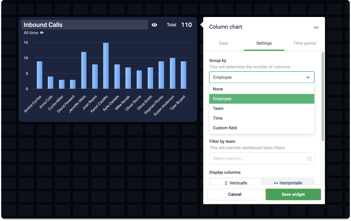 You can group data by employees, teams, and sometimes time and custom fields. Say you have a formula that counts the Number of Opportunities in your data source. Here are some examples of how you could group the data: