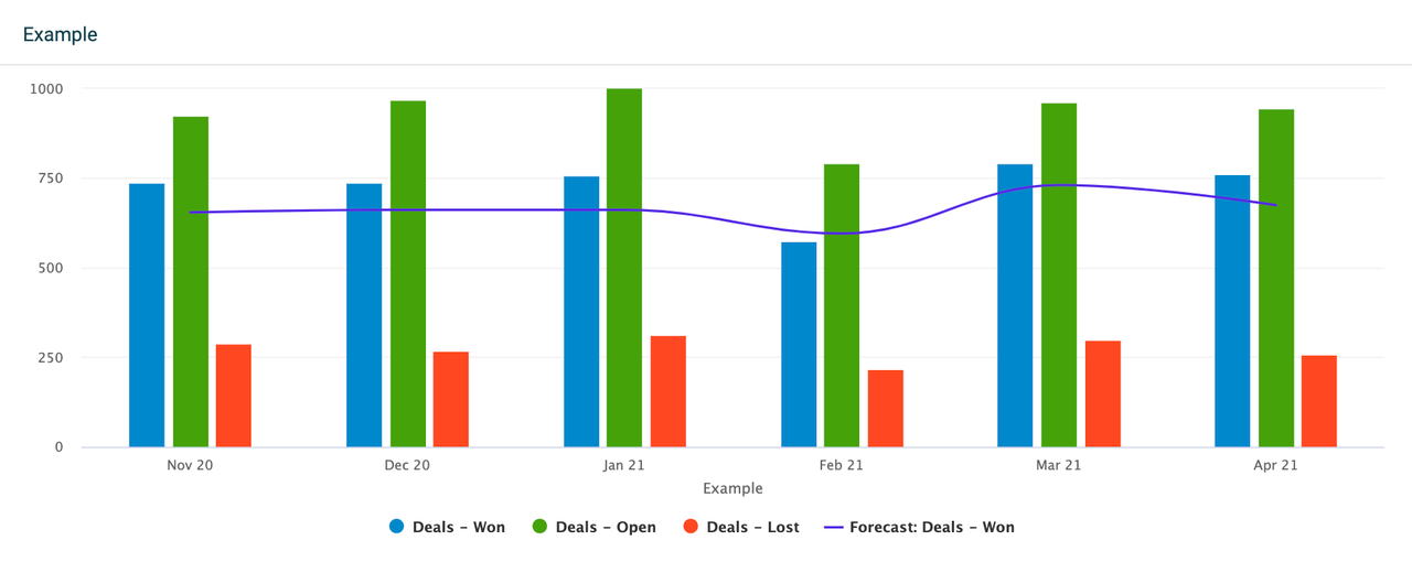 You can drill down your metrics by specific parameters, based on the fields available in your data source that the formulas are built on. For example, if you display the number of all sales deals, you can drill the data down by stage to see how many deals are open, lost, won, etc.